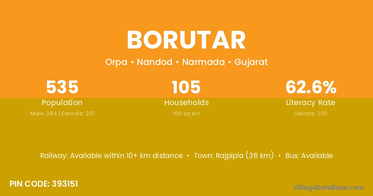 Rajpipla (36 km) is the nearest town to Borutar village for major economic activities and is located approximately 36 km away.