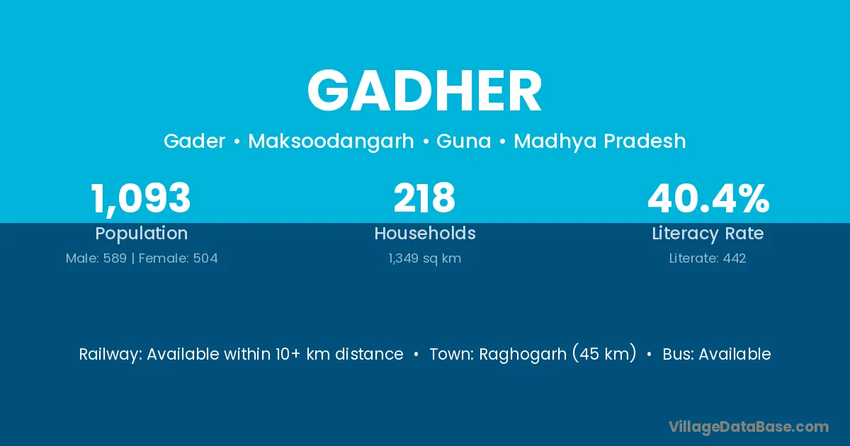 Rajpipla (45 km) is the nearest town to Gadher village for major economic activities and is located approximately 45 km away.