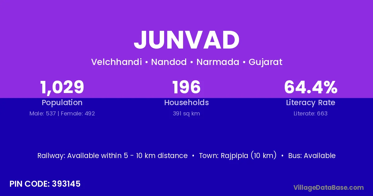 Rajpipla (10 km) is the nearest town to Junvad village for major economic activities and is located approximately 10 km away.