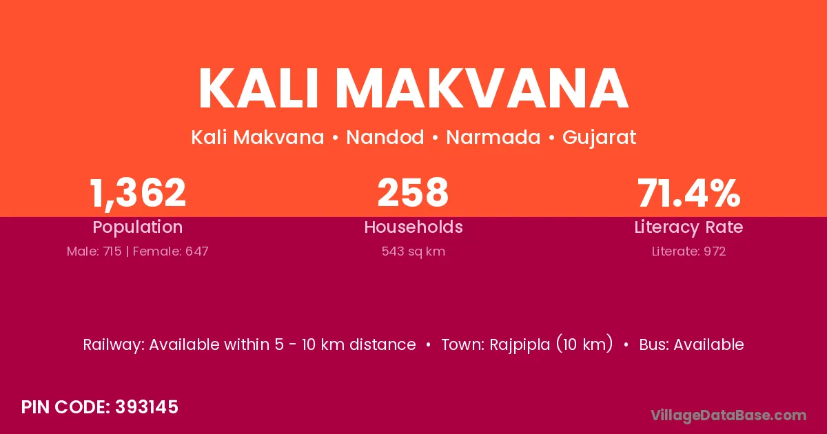 Rajpipla (10 km) is the nearest town to Kali Makvana village for major economic activities and is located approximately 10 km away.