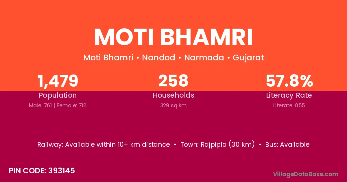 Rajpipla (30 km) is the nearest town to Moti Bhamri village for major economic activities and is located approximately 30 km away.