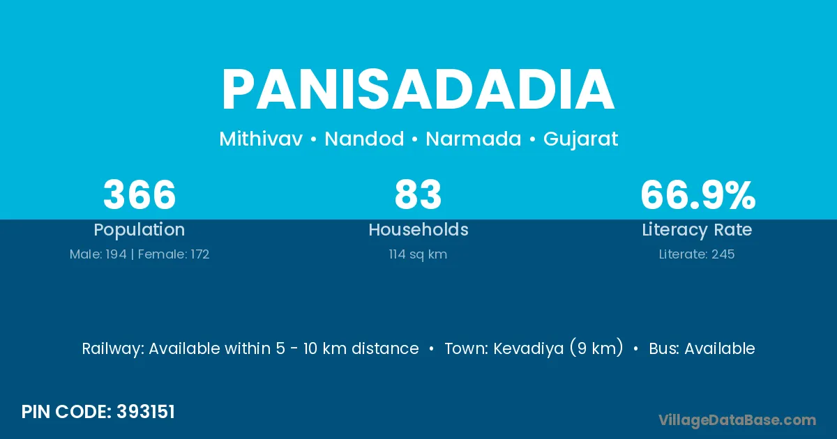 Kevadiya (9 km) is the nearest town to Panisadadia village for major economic activities and is located approximately 9 km away.
