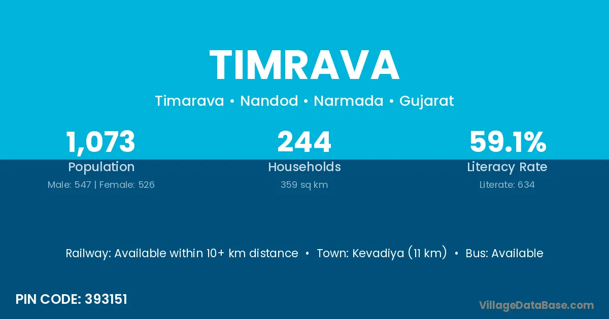 Kevadiya (11 km) is the nearest town to Timrava village for major economic activities and is located approximately 11 km away.