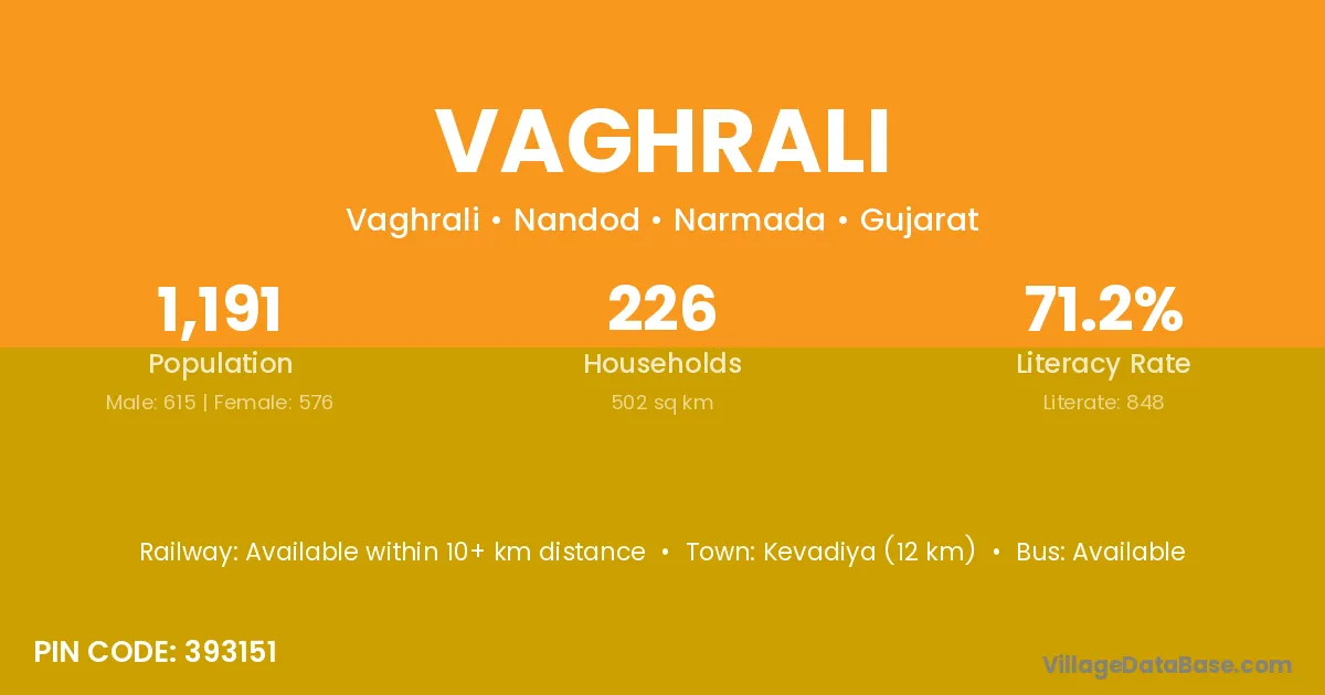 Kevadiya (12 km) is the nearest town to Vaghrali village for major economic activities and is located approximately 12 km away.