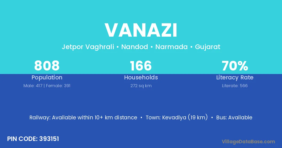 Kevadiya (19 km) is the nearest town to Vanazi village for major economic activities and is located approximately 19 km away.