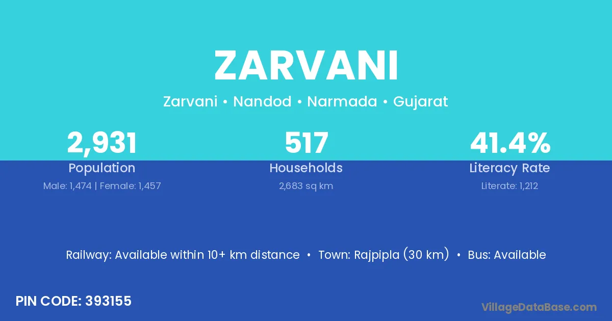 Rajpipla (30 km) is the nearest town to Zarvani village for major economic activities and is located approximately 30 km away.