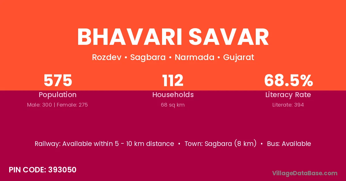 Sagbara (8 km) is the nearest town to Bhavari Savar village for major economic activities and is located approximately 8 km away.