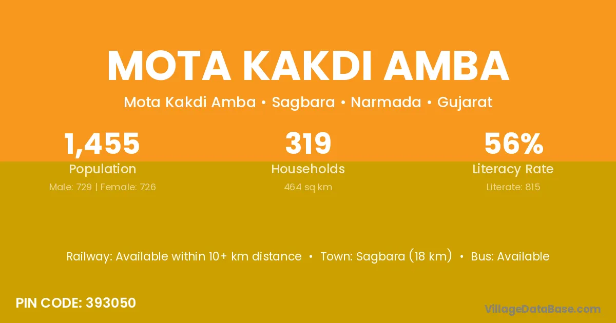Mota Kakdi Amba village has a total population of 1,455 people, of which 729 are males and 726 are females.