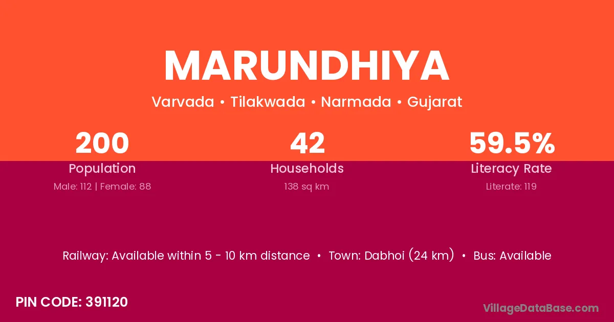 Dabhoi (24 km) is the nearest town to Marundhiya village for major economic activities and is located approximately 24 km away.