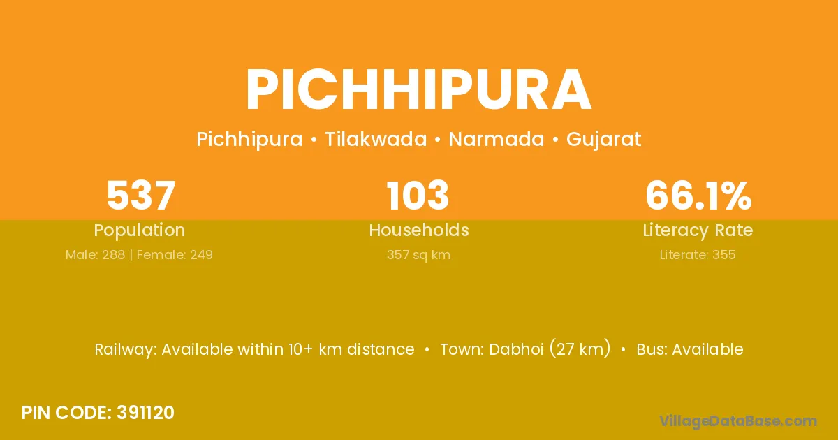 Dabhoi (27 km) is the nearest town to Pichhipura village for major economic activities and is located approximately 27 km away.
