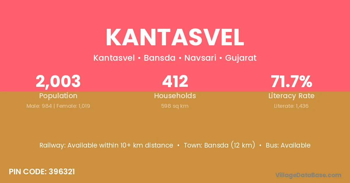 Bansda (12 km) is the nearest town to Kantasvel village for major economic activities and is located approximately 12 km away.