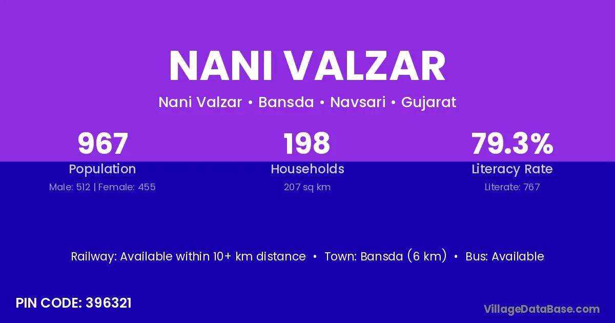 Bansda (6 km) is the nearest town to Nani Valzar village for major economic activities and is located approximately 6 km away.