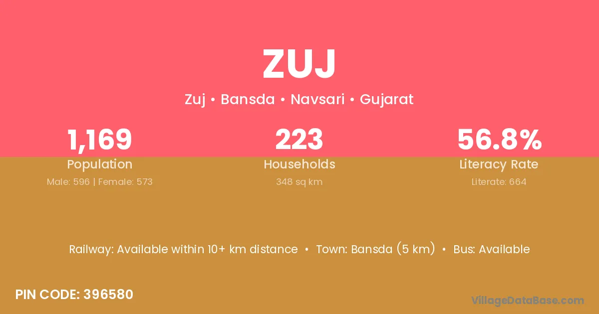 Bansda (5 km) is the nearest town to Zuj village for major economic activities and is located approximately 5 km away.
