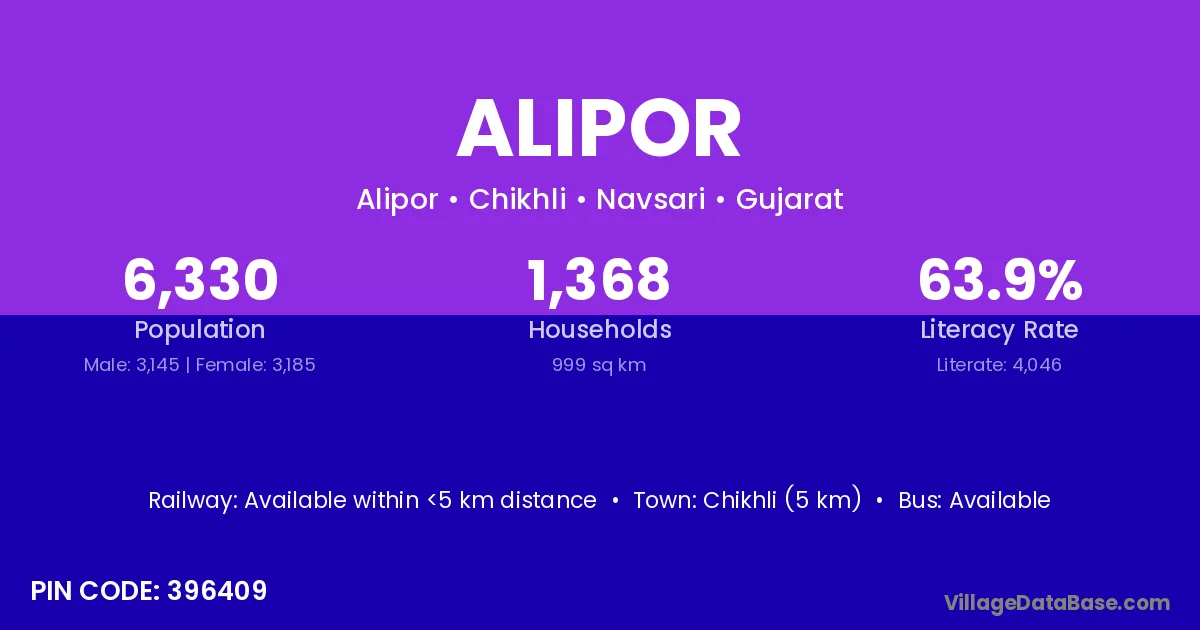 Chikhli (5 km) is the nearest town to Alipor village for major economic activities and is located approximately 5 km away.