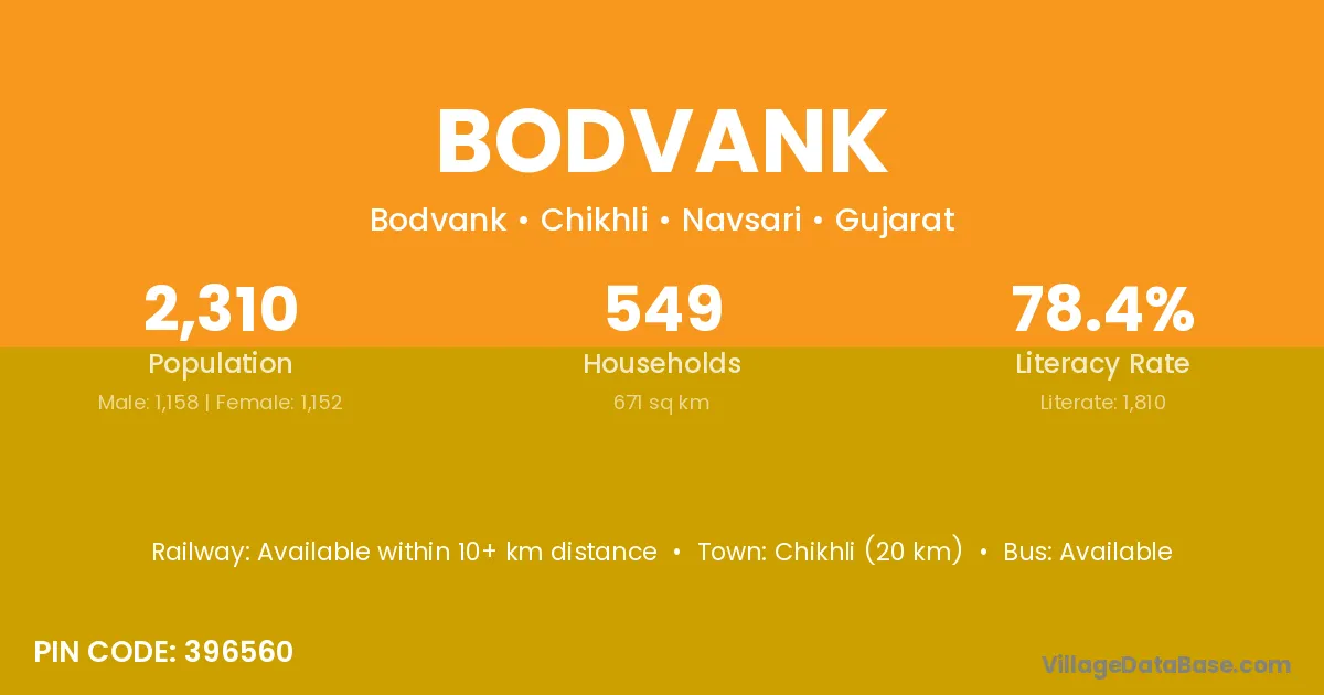 Chikhli (20 km) is the nearest town to Bodvank village for major economic activities and is located approximately 20 km away.