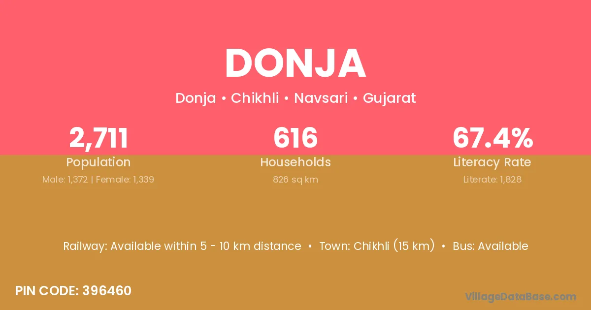 Chikhli (15 km) is the nearest town to Donja village for major economic activities and is located approximately 15 km away.