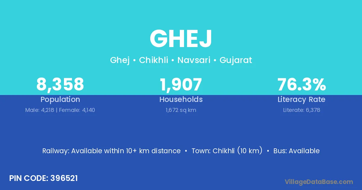 Chikhli (10 km) is the nearest town to Ghej village for major economic activities and is located approximately 10 km away.