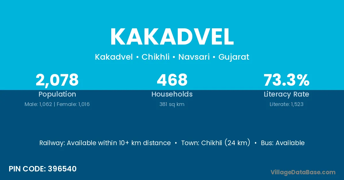 Chikhli (24 km) is the nearest town to Kakadvel village for major economic activities and is located approximately 24 km away.