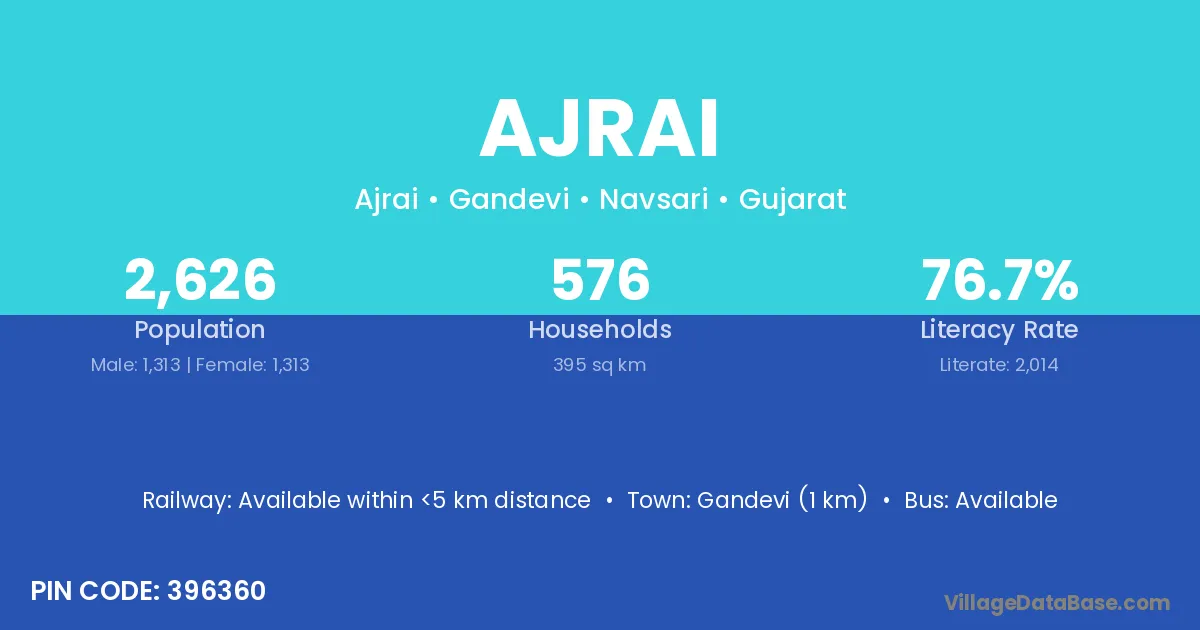Gandevi (1 km) is the nearest town to Ajrai village for major economic activities and is located approximately 1 km away.