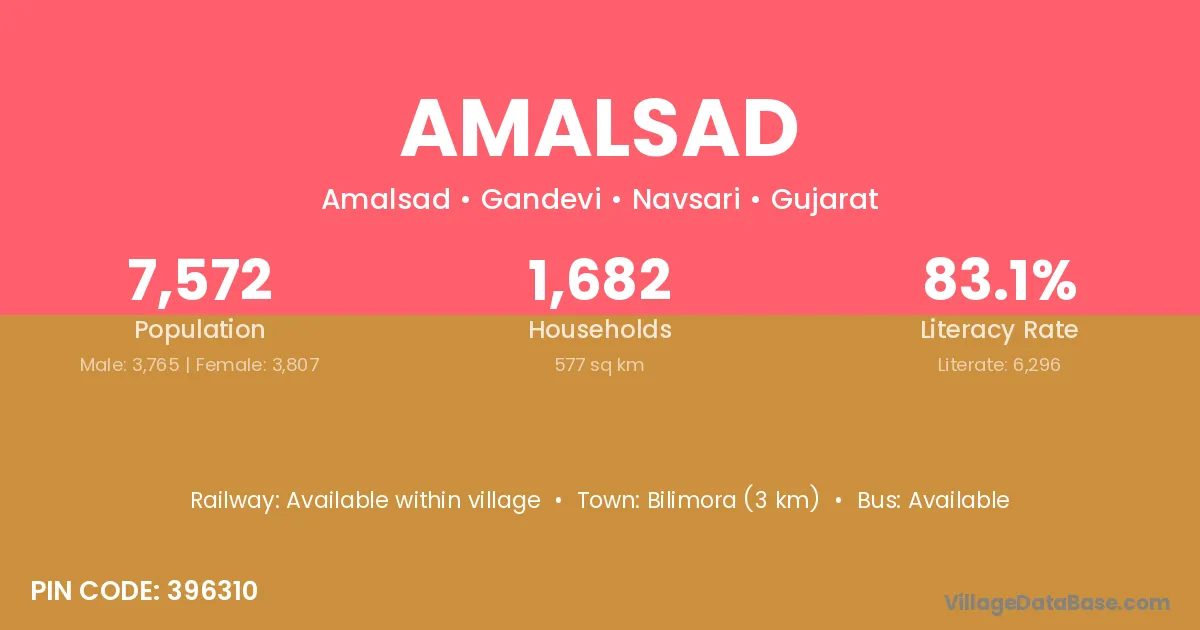 Bilimora (3 km) is the nearest town to Amalsad village for major economic activities and is located approximately 3 km away.