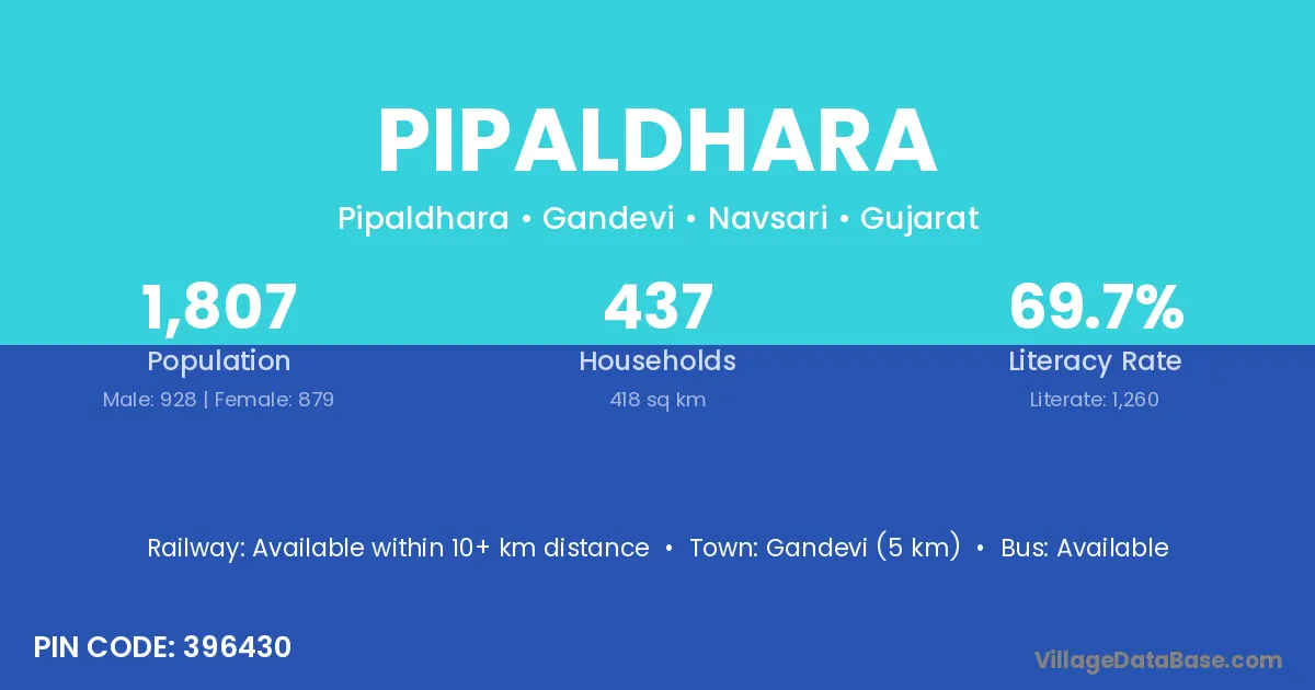 Gandevi (5 km) is the nearest town to Pipaldhara village for major economic activities and is located approximately 5 km away.