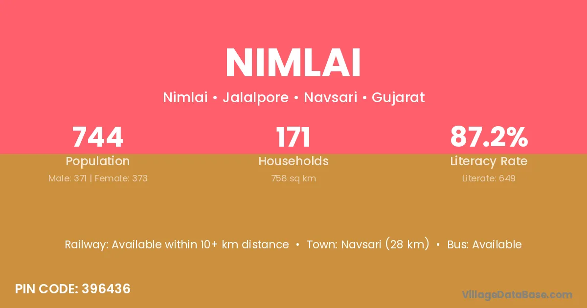 Navsari (28 km) is the nearest town to Nimlai village for major economic activities and is located approximately 28 km away.