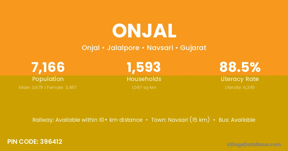 Navsari (15 km) is the nearest town to Onjal village for major economic activities and is located approximately 15 km away.