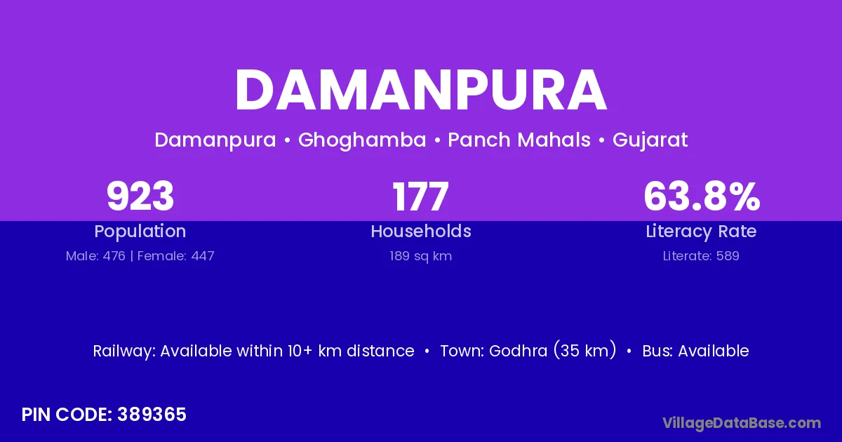 Godhra (35 km) is the nearest town to Damanpura village for major economic activities and is located approximately 35 km away.