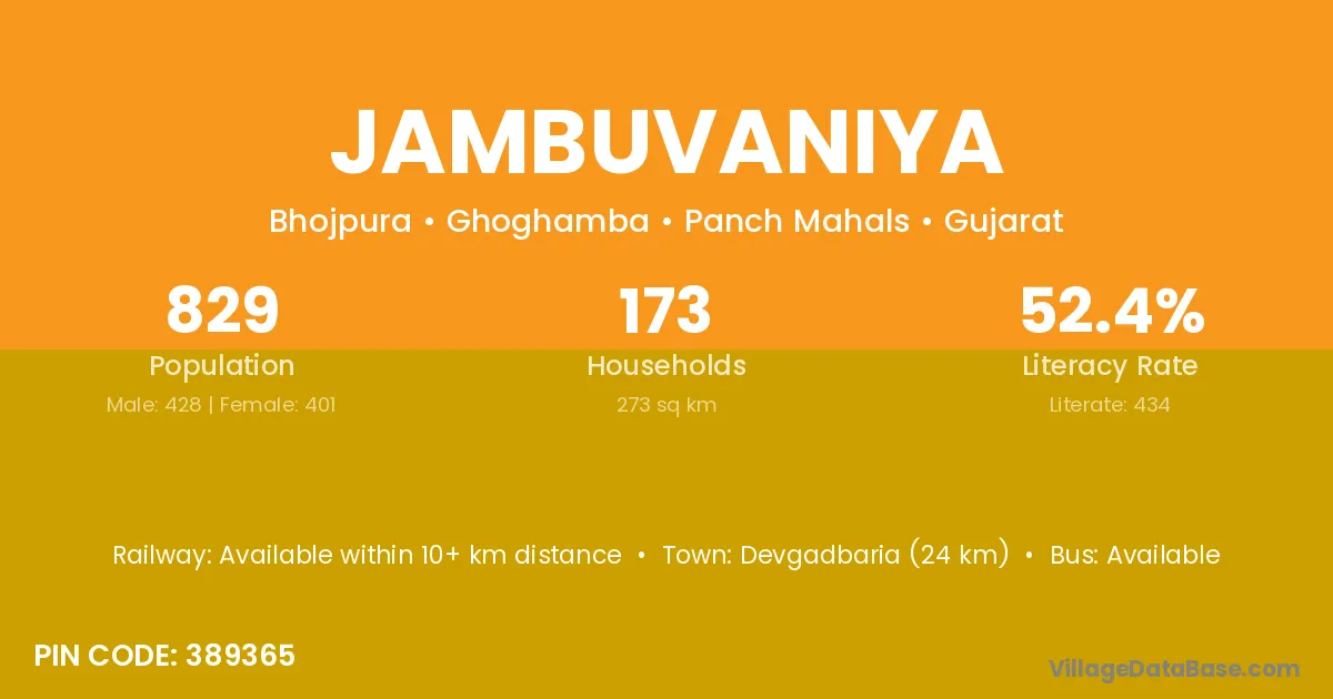 Jambuvaniya village has a total population of 829 people, of which 428 are males and 401 are females.