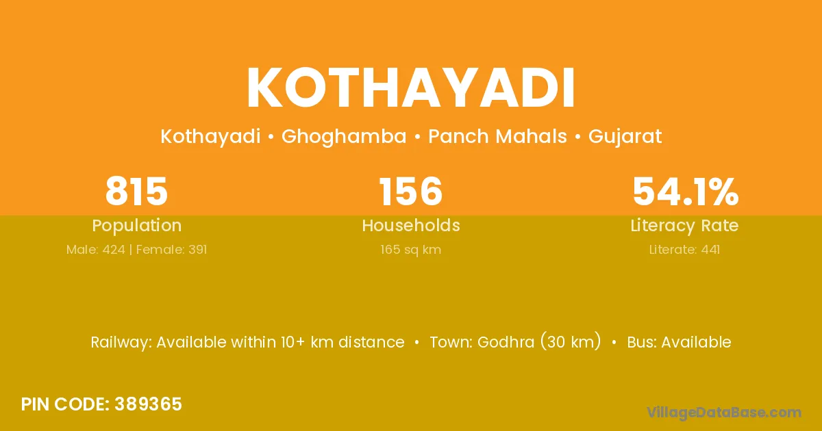 Godhra (30 km) is the nearest town to Kothayadi village for major economic activities and is located approximately 30 km away.
