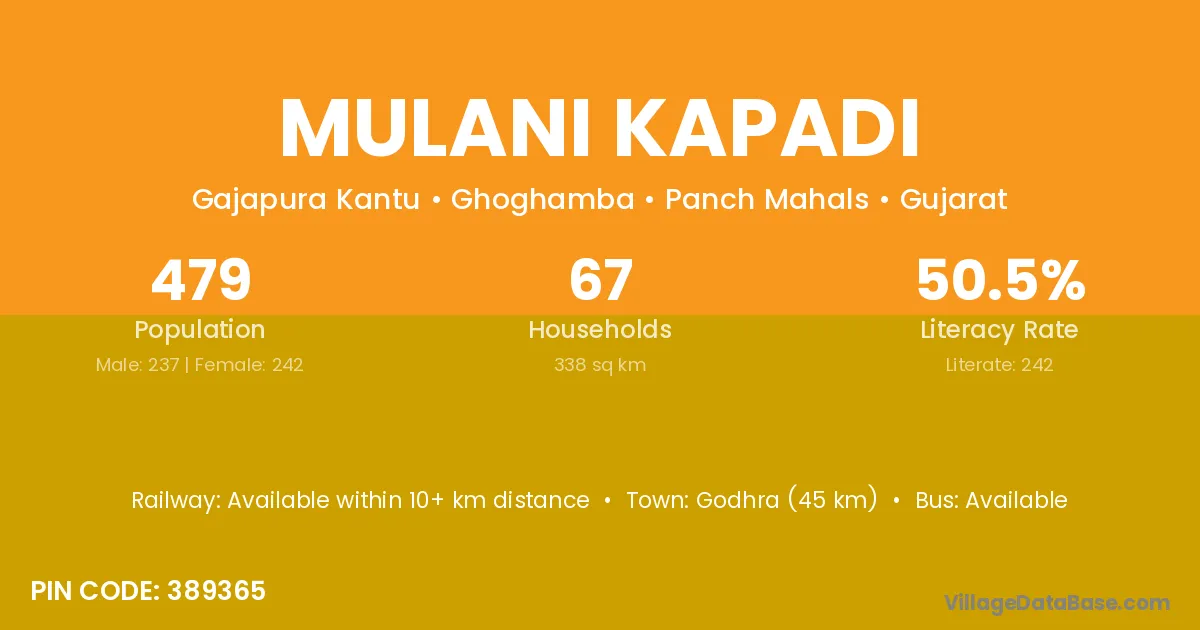 Godhra (45 km) is the nearest town to Mulani Kapadi village for major economic activities and is located approximately 45 km away.