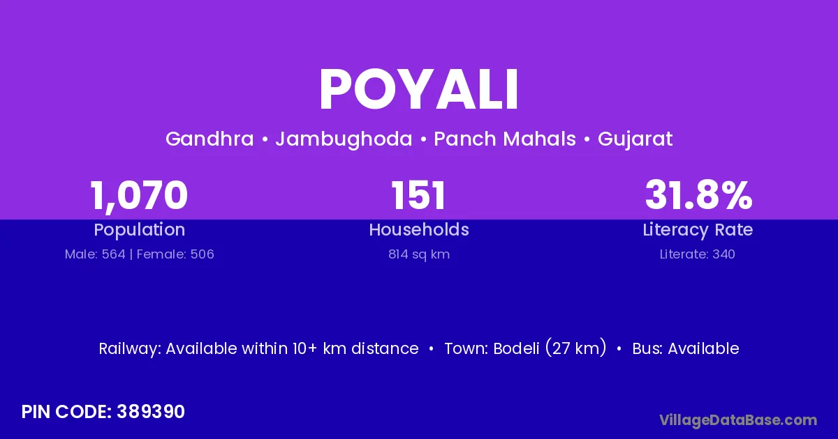 Halol (27 km) is the nearest town to Poyali village for major economic activities and is located approximately 27 km away.