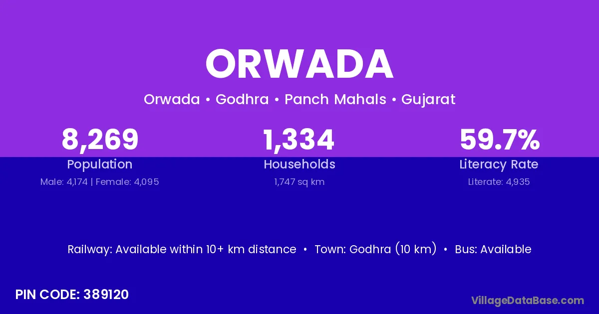 Godhra (10 km) is the nearest town to Orwada village for major economic activities and is located approximately 10 km away.