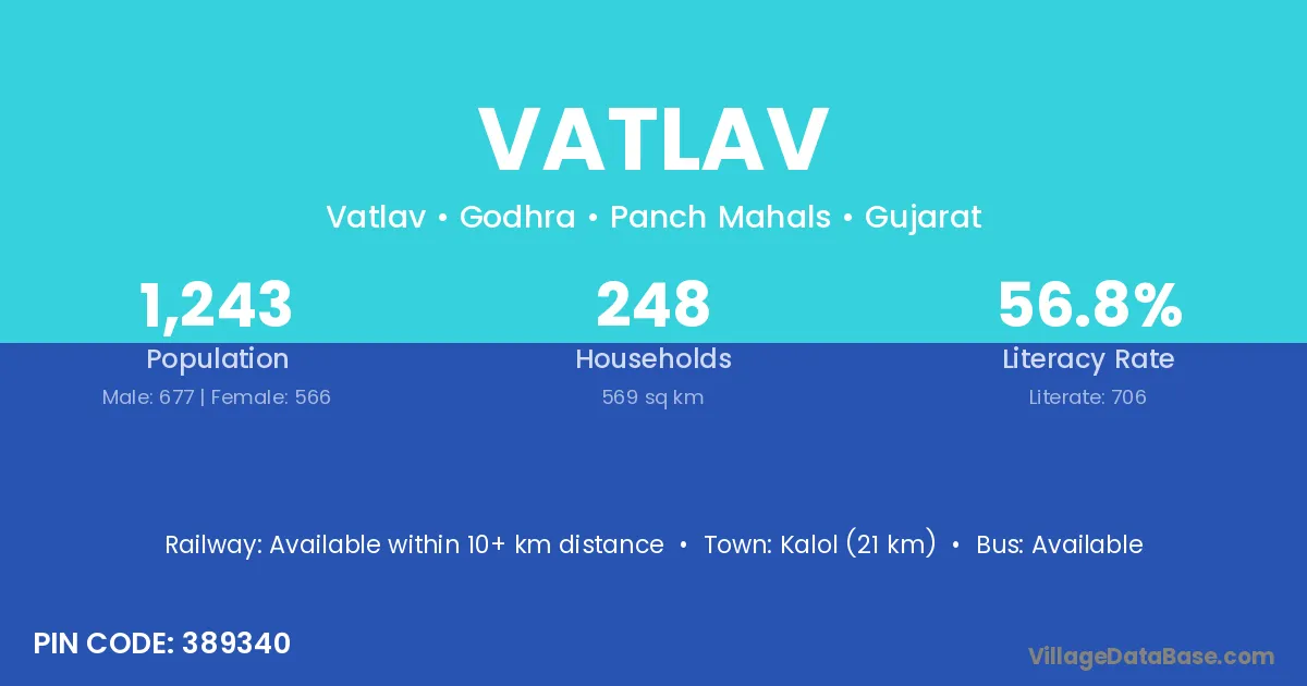 Kalol (21 km) is the nearest town to Vatlav village for major economic activities and is located approximately 21 km away.
