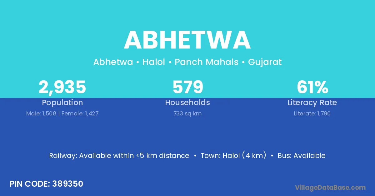 Halol (4 km) is the nearest town to Abhetwa village for major economic activities and is located approximately 4 km away.