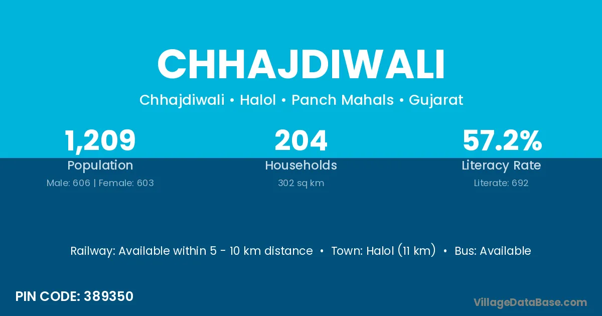 Halol (11 km) is the nearest town to Chhajdiwali village for major economic activities and is located approximately 11 km away.