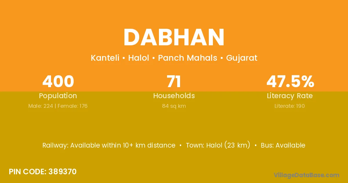 Halol (23 km) is the nearest town to Dabhan village for major economic activities and is located approximately 23 km away.