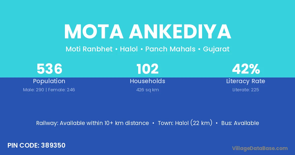 Mota Ankediya village has a total population of 536 people, of which 290 are males and 246 are females.