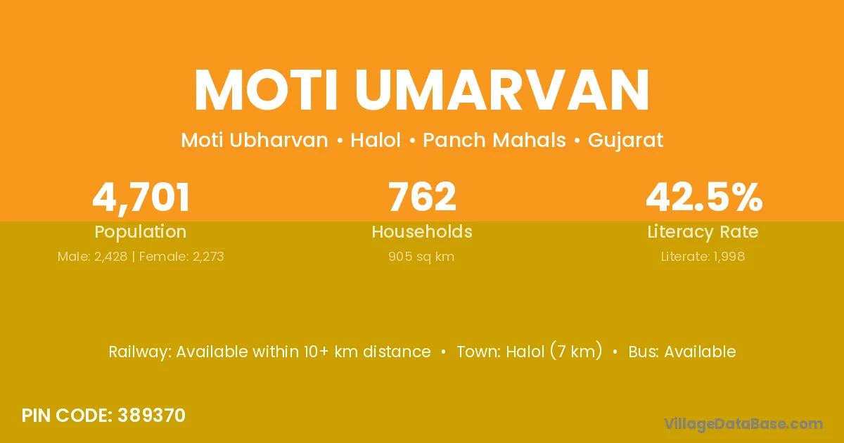 Halol (7 km) is the nearest town to Moti Umarvan village for major economic activities and is located approximately 7 km away.
