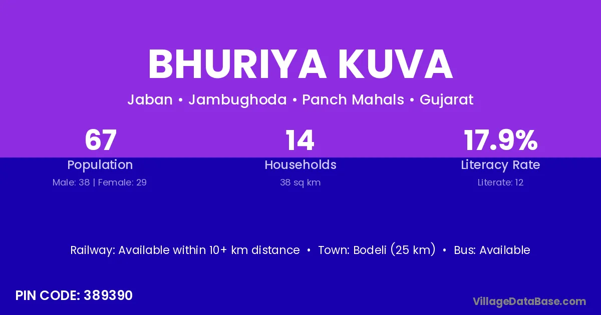 Bhuriya Kuva village has a total population of 67 people, of which 38 are males and 29 are females.