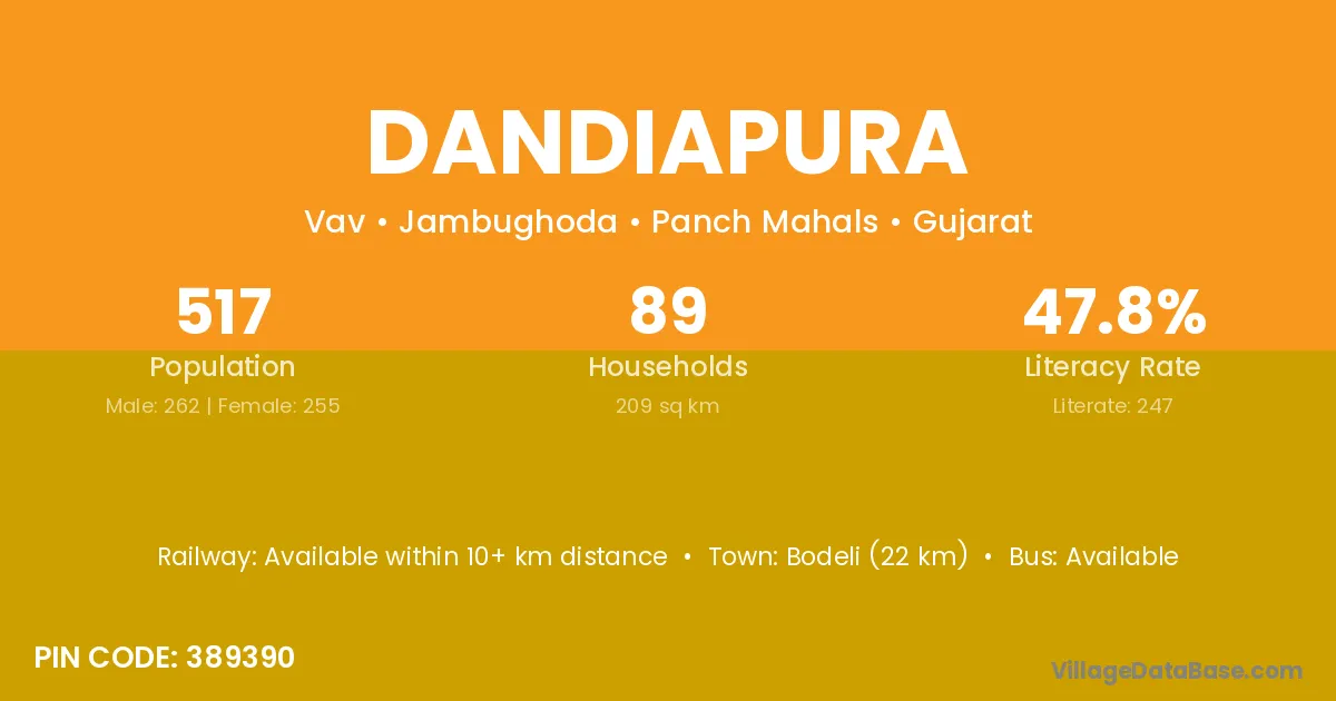 Bodeli (22 km) is the nearest town to Dandiapura village for major economic activities and is located approximately 22 km away.