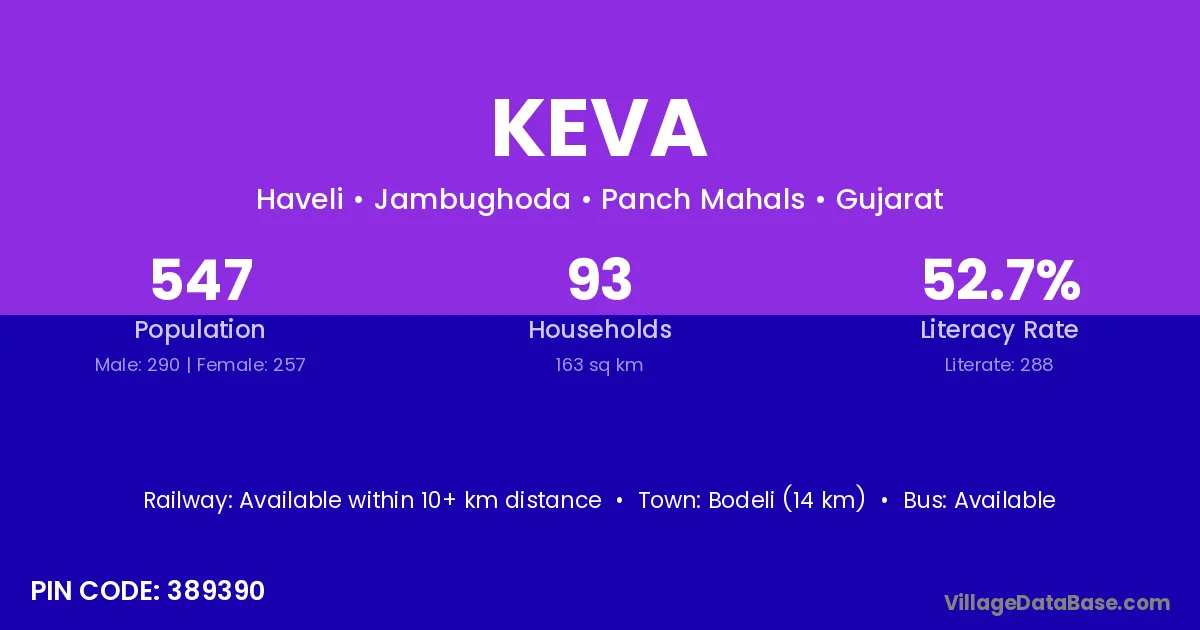 According to Census 2011 information, the village code of Keva village is 389390.
