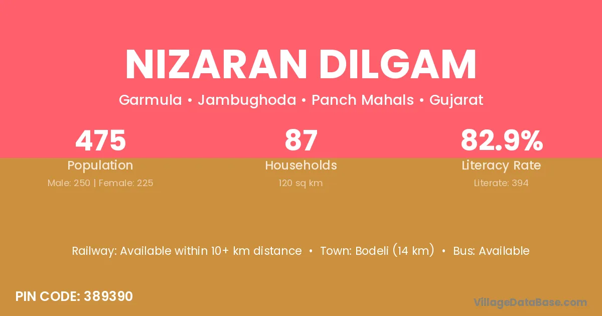 Bodeli (14 km) is the nearest town to Nizaran Dilgam village for major economic activities and is located approximately 14 km away.