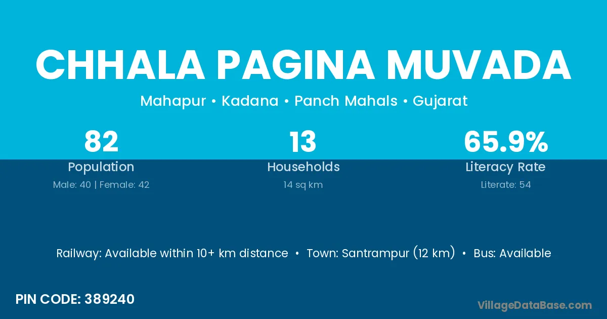 Santrampur (12 km) is the nearest town to Chhala Pagina Muvada village for major economic activities and is located approximately 12 km away.