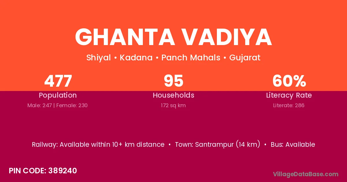 According to Census 2011 information, the village code of Ghanta Vadiya village is 389240.