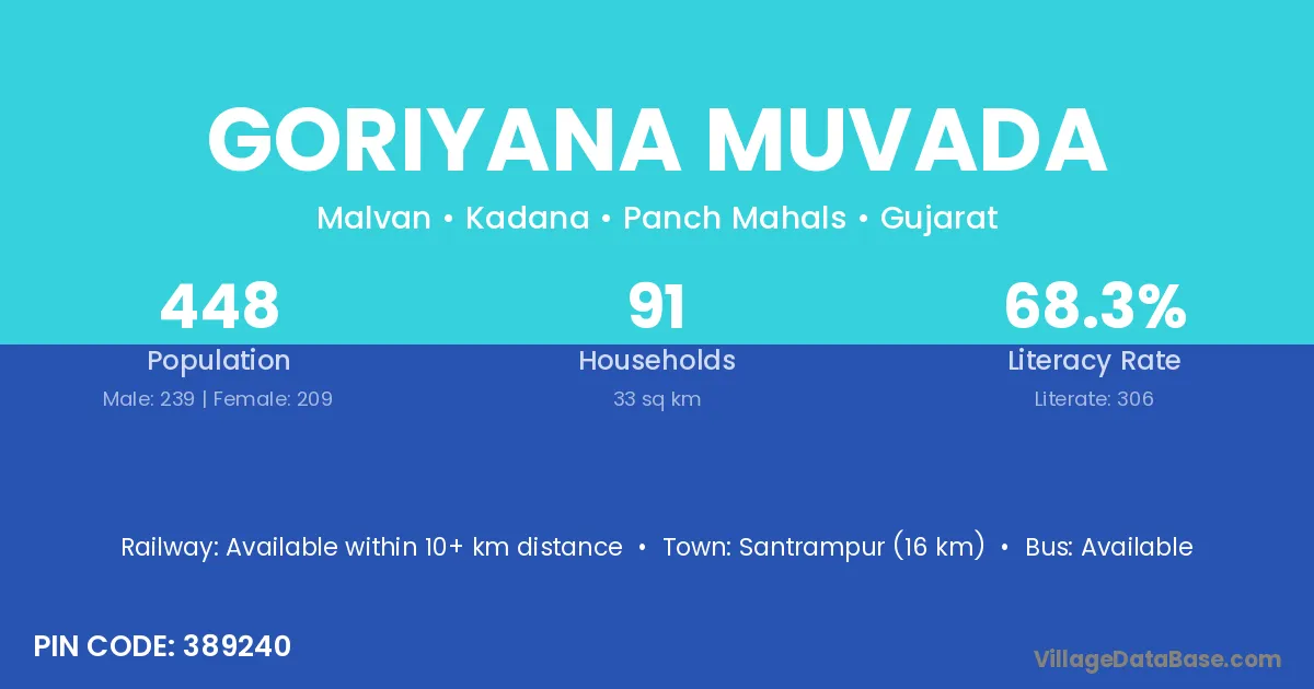 Santrampur (16 km) is the nearest town to Goriyana Muvada village for major economic activities and is located approximately 16 km away.