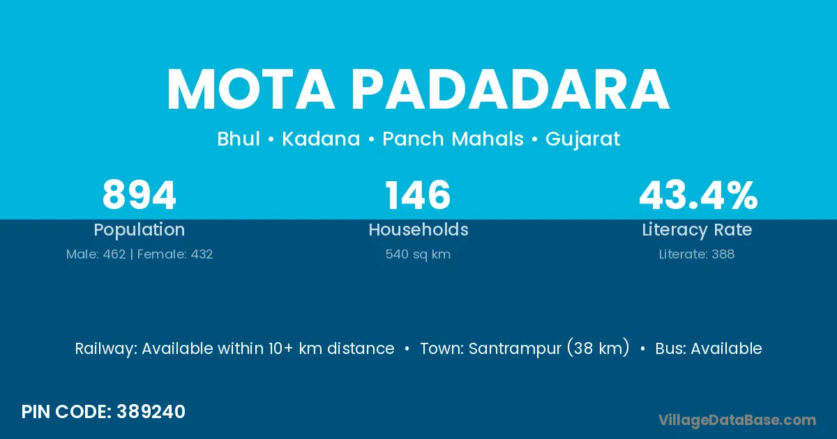 According to Census 2011 information, the village code of Mota Padadara village is 389240.