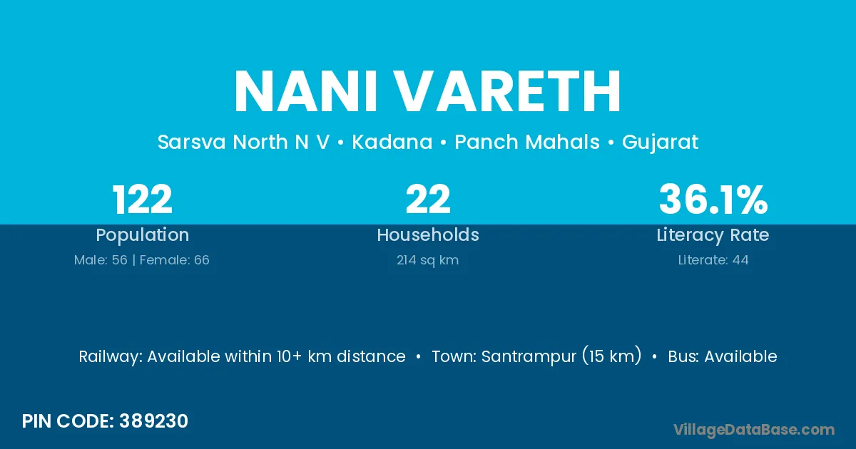 Santrampur (15 km) is the nearest town to Nani Vareth village for major economic activities and is located approximately 15 km away.