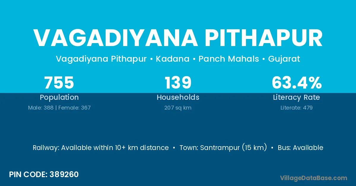Santrampur (15 km) is the nearest town to Vagadiyana Pithapur village for major economic activities and is located approximately 15 km away.