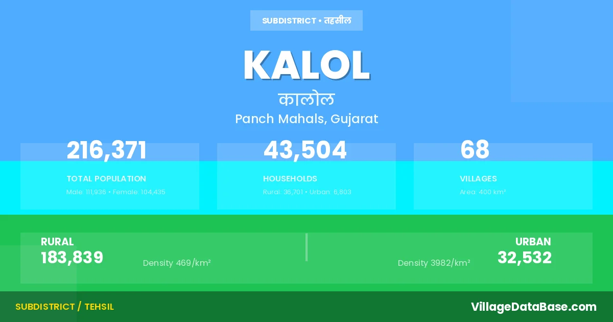 According to the 2011 census The total area of Kalol Taluka is 400 km², with a population of 216371 people. The population density is 541 inhabitants per square kilometre, and there are approximately 43504 houses in the sub district.